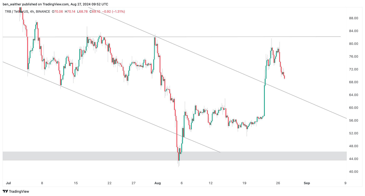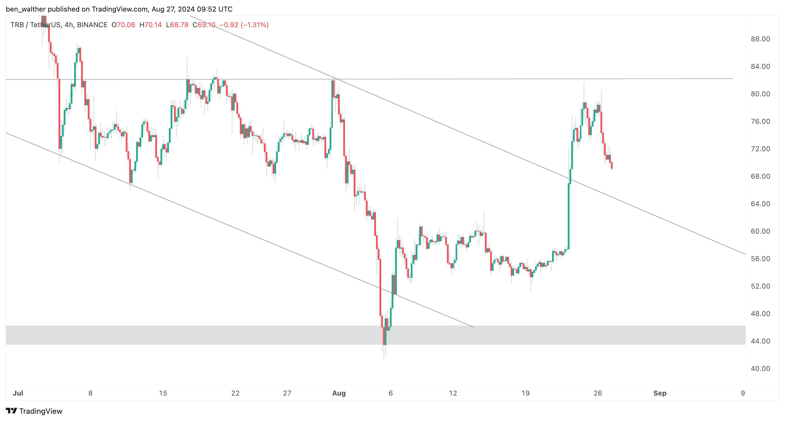 Option 1: This trade setup considers the case that TRB retests its breakout out of the downtrend channel.